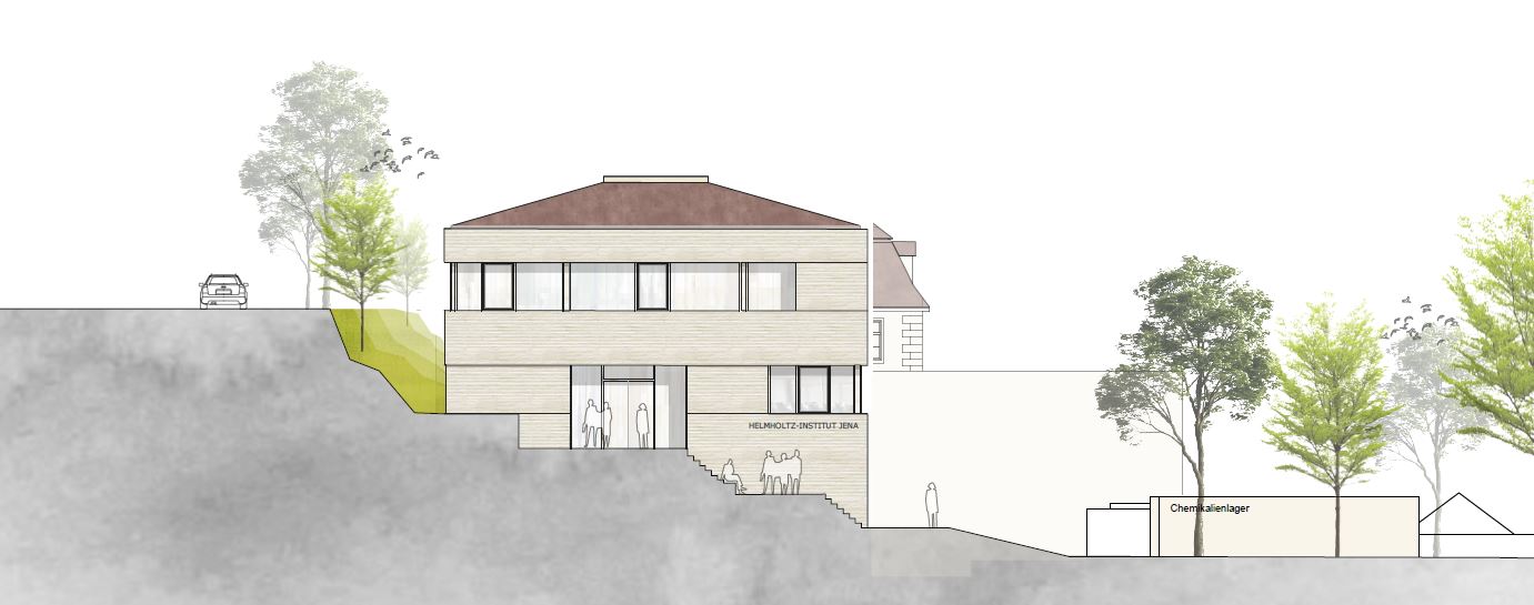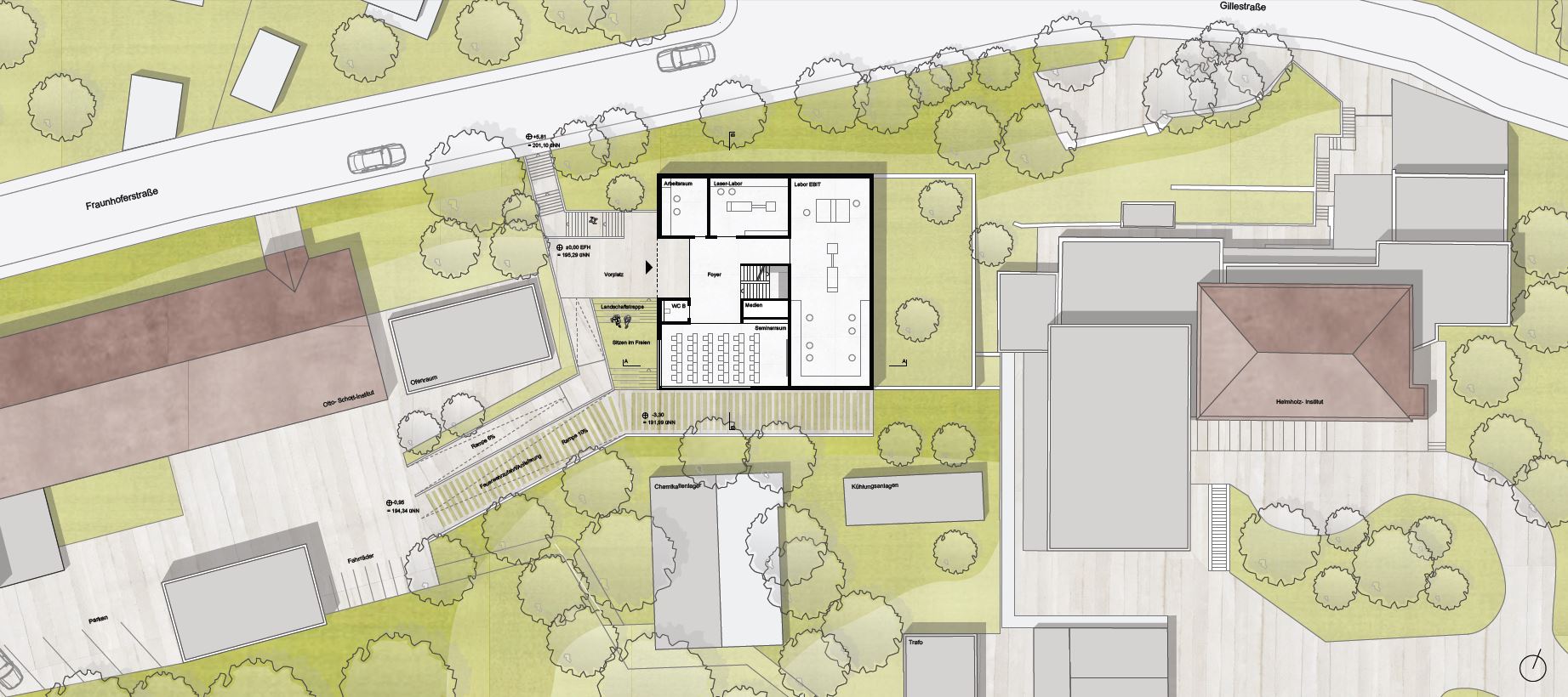 Zur Ostrower Straße bleibt der Blockrand zwar bewahrt, öffnet sich jedoch zu Gunsten eines kleinen Quartierplatzes, wobei die neue Mitte des Blocks abgeschirmt wird und für die Bewohner des Baufeldes vorgesehen ist: Die erhöhten Gebäude erinnern an das, in der Gründerzeit typische, Hochparterre und bedienen sich dessen Vorteile: Entfernung der Erdgeschosswohnungen von der Straße und deren Emissionen sowie kein direkter Einblick und private und abgeschirmte Freiräume auf der Insel. Gleichzeitig entsteht so ein belichteter und durchlüfteter „Sockel“, in dem die Stellplätze, Technik, Lager- und Kellerräume untergebracht sind. Die neue Bebauung sieht lediglich drei Häusertypen vor: Ein L-Riegel zur Abschirmung der Franz-Mehringstraße, als Laubengangtyp für die Sonderwohnformen für Senioren und WGs. Zwei Riegel für den sozialen Wohnungsbau entlang der Briesmannstraße zur Schaffung einer ruhigen, privaten Mitte, sowie Punkthäuser und ein Riegel für die frei finanzierten Miet- und Eigentumswohnungen.