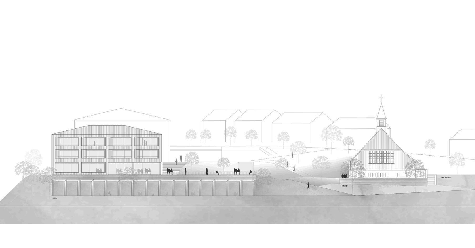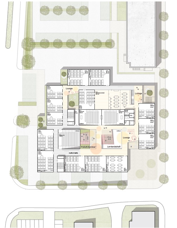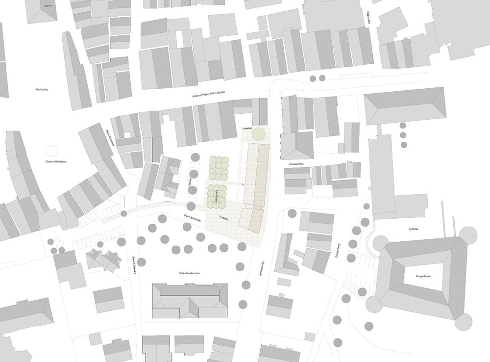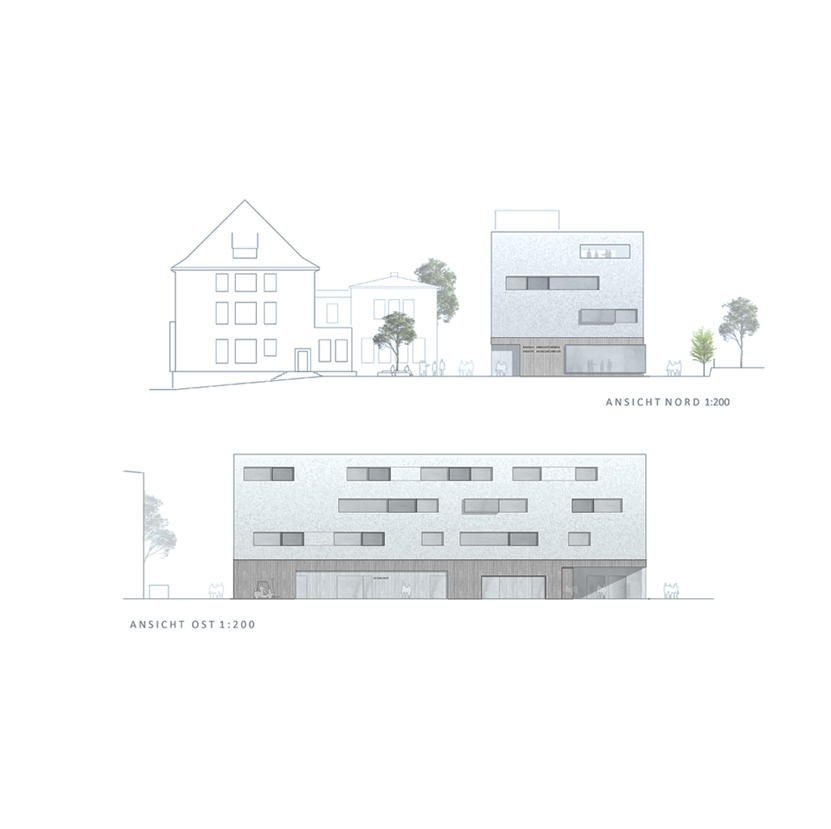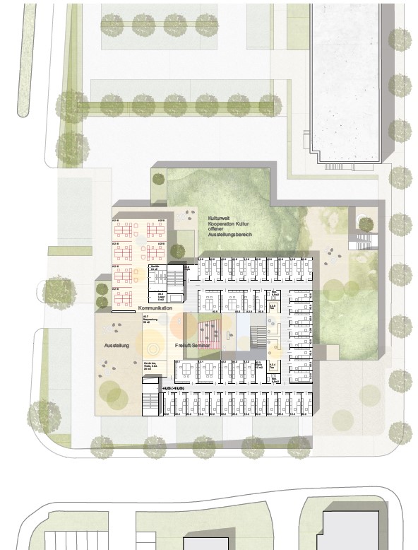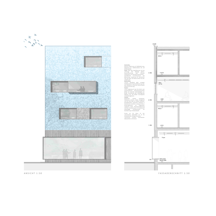 Die Beziehung zur Paulskirche wurde vorrangig behandelt. Das neue Rastersystem, das leicht zum bestehenden Raster der Paulskirche und des Platzes geneigt ist, schafft eine Lücke zwischen der Kirche und HDD. Dieser wird zum Haupteingang des Gebäudes, zu einem Raum, der Vergangenheit und Zukunft miteinander verbindet. Die Treppe zur Terrasse neben dem Haupteingang erinnert an den historischen Platz vor und nach dem Krieg, und die Mauer der Treppe bildet eine klare Grenze zwischen dem Platz und HDD. Auf diese Weise wird die Beziehung zwischen der Kirche, HDD und dem Platz ausgeglichen und in die Zukunft als ein historischer Ort weitergegeben. Das Konzept des Gebäudes basiert auf dem Raum einer Kirche, mit der Absicht, Vergangenheit und Gegenwart nebeneinander bestehen zu lassen. Die zentrale Treppe, die vom Kirchturm inspiriert ist, nutzt digitale Wände zur Information der Besucher. Die Funktion des Platzes wurde beibehalten und der fehlende öffentliche Raum wurde durch Terrassen ersetzt. Diese Terrassen erweitern nicht nur den Innenraum, sondern verbinden den Stadtraum auch visuell. Das harmonische Ensemble von Kirchen, Plätzen und Neubauten im Stadtraum entspricht den Grundsätzen der Demokratie.