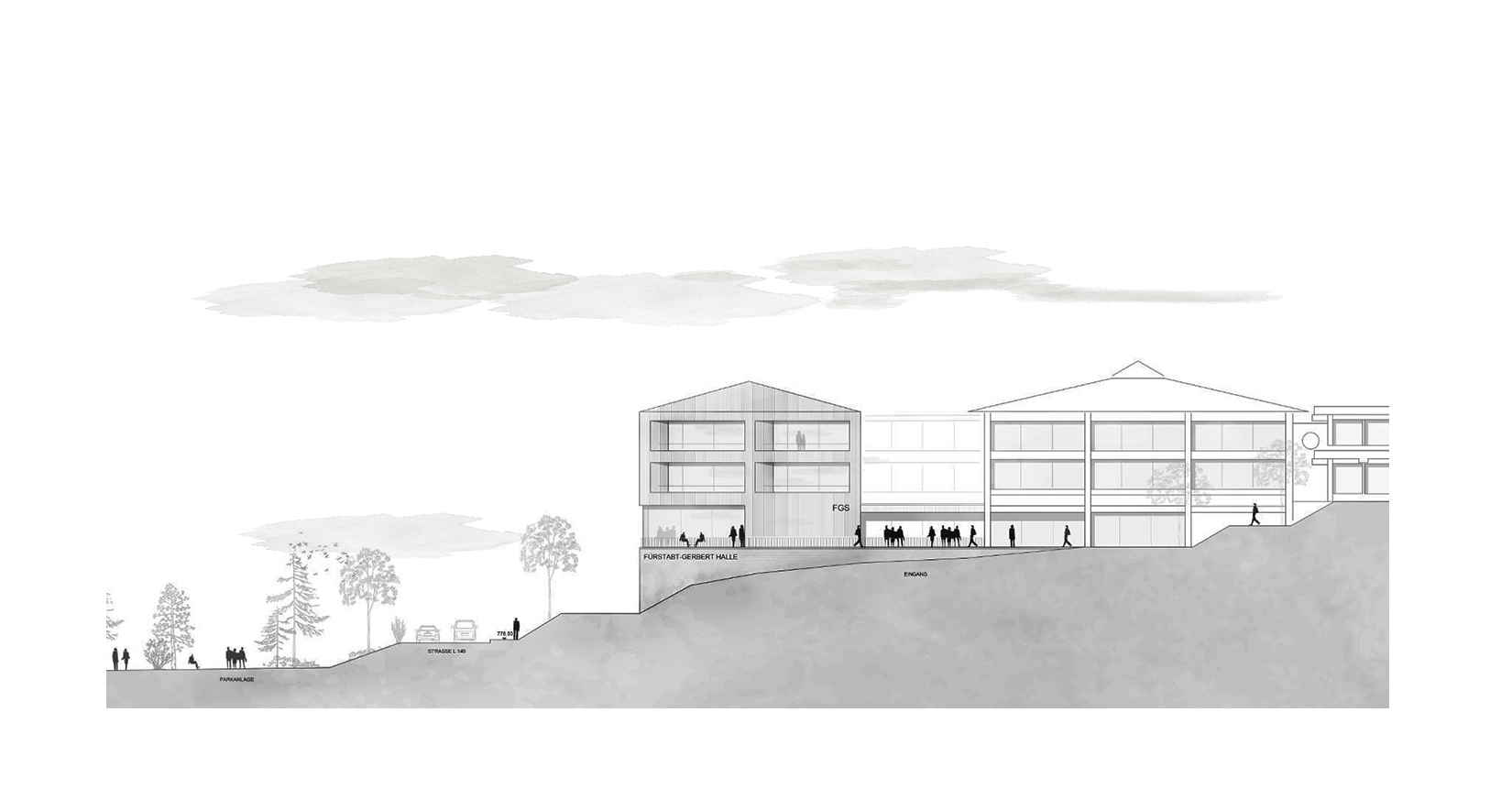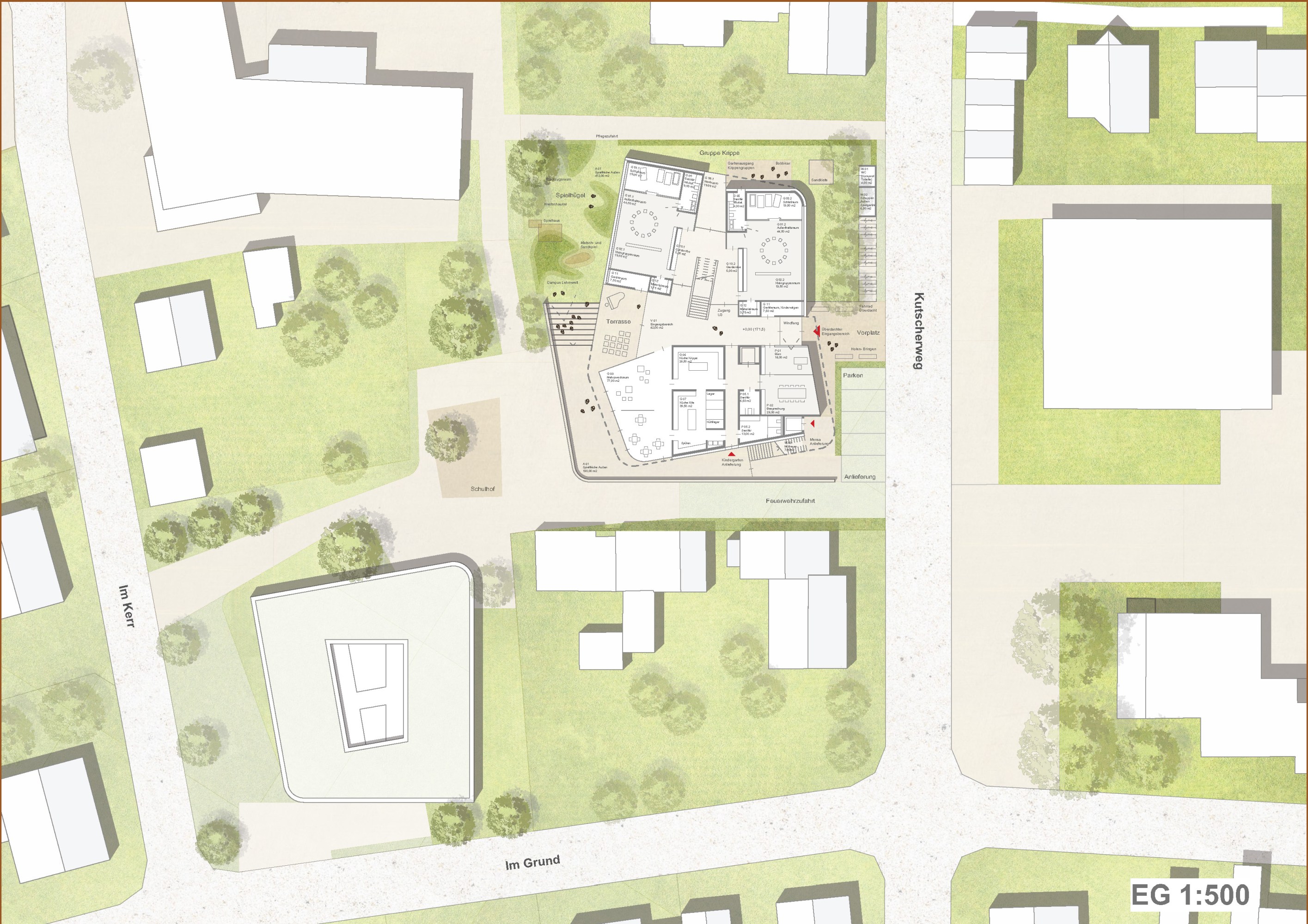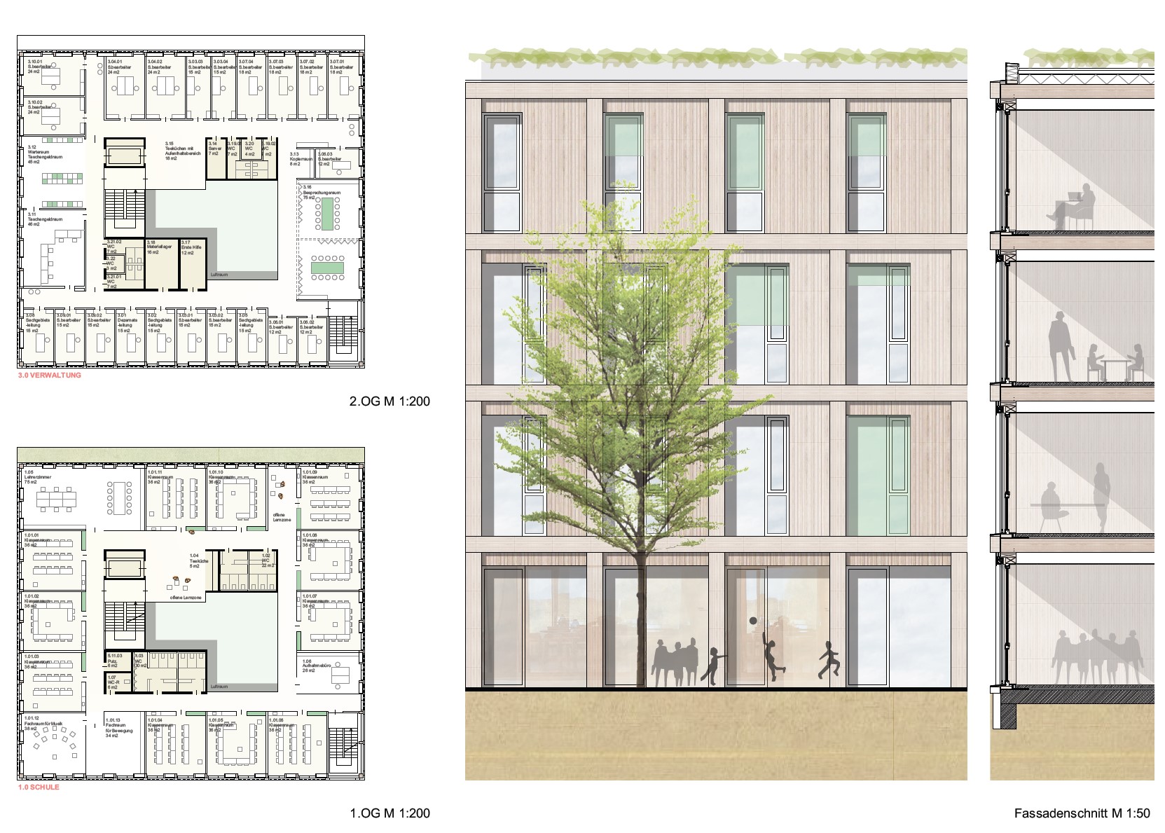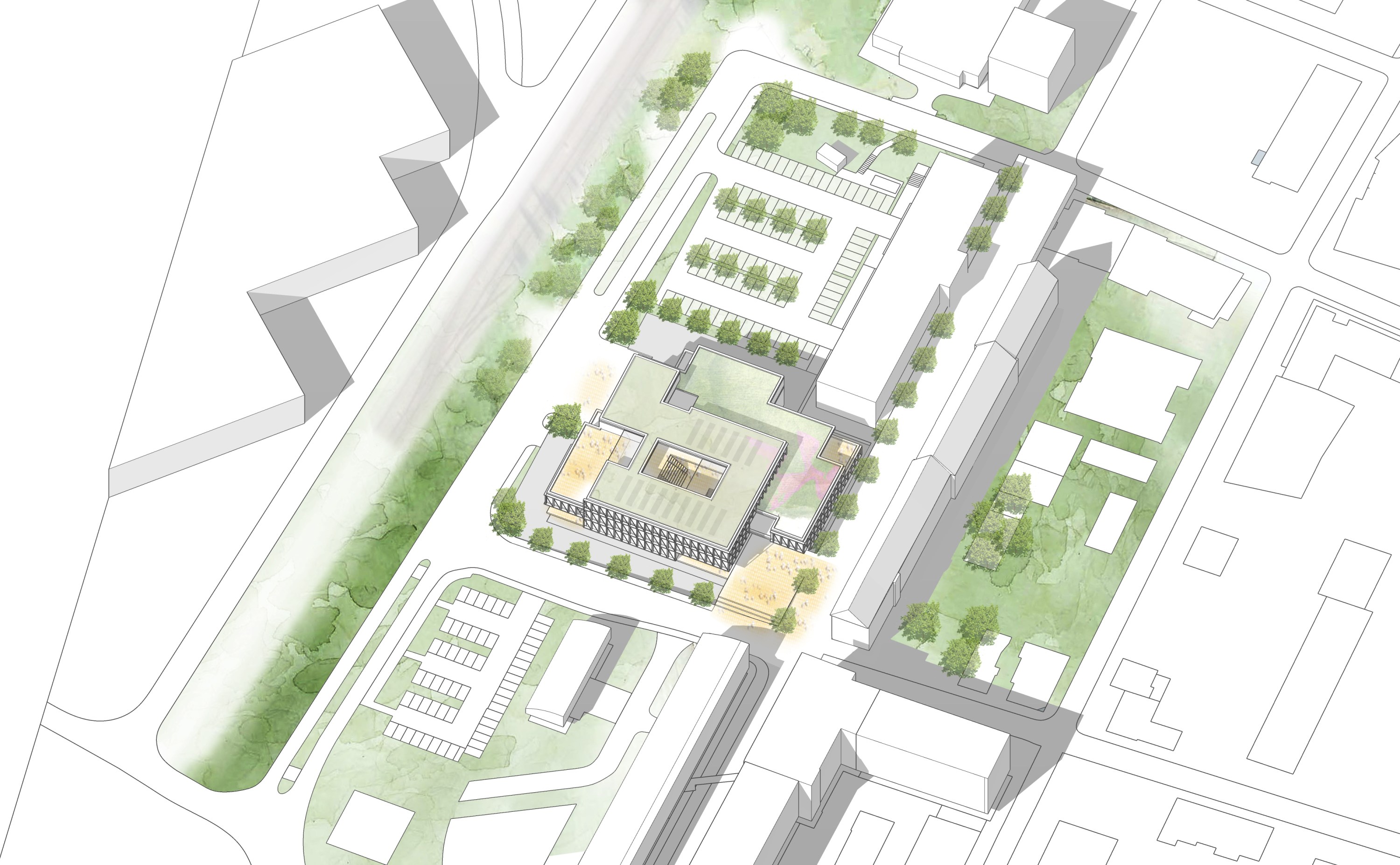Die Beziehung zur Paulskirche wurde vorrangig behandelt. Das neue Rastersystem, das leicht zum bestehenden Raster der Paulskirche und des Platzes geneigt ist, schafft eine Lücke zwischen der Kirche und HDD. Dieser wird zum Haupteingang des Gebäudes, zu einem Raum, der Vergangenheit und Zukunft miteinander verbindet. Die Treppe zur Terrasse neben dem Haupteingang erinnert an den historischen Platz vor und nach dem Krieg, und die Mauer der Treppe bildet eine klare Grenze zwischen dem Platz und HDD. Auf diese Weise wird die Beziehung zwischen der Kirche, HDD und dem Platz ausgeglichen und in die Zukunft als ein historischer Ort weitergegeben. Das Konzept des Gebäudes basiert auf dem Raum einer Kirche, mit der Absicht, Vergangenheit und Gegenwart nebeneinander bestehen zu lassen. Die zentrale Treppe, die vom Kirchturm inspiriert ist, nutzt digitale Wände zur Information der Besucher. Die Funktion des Platzes wurde beibehalten und der fehlende öffentliche Raum wurde durch Terrassen ersetzt. Diese Terrassen erweitern nicht nur den Innenraum, sondern verbinden den Stadtraum auch visuell. Das harmonische Ensemble von Kirchen, Plätzen und Neubauten im Stadtraum entspricht den Grundsätzen der Demokratie.