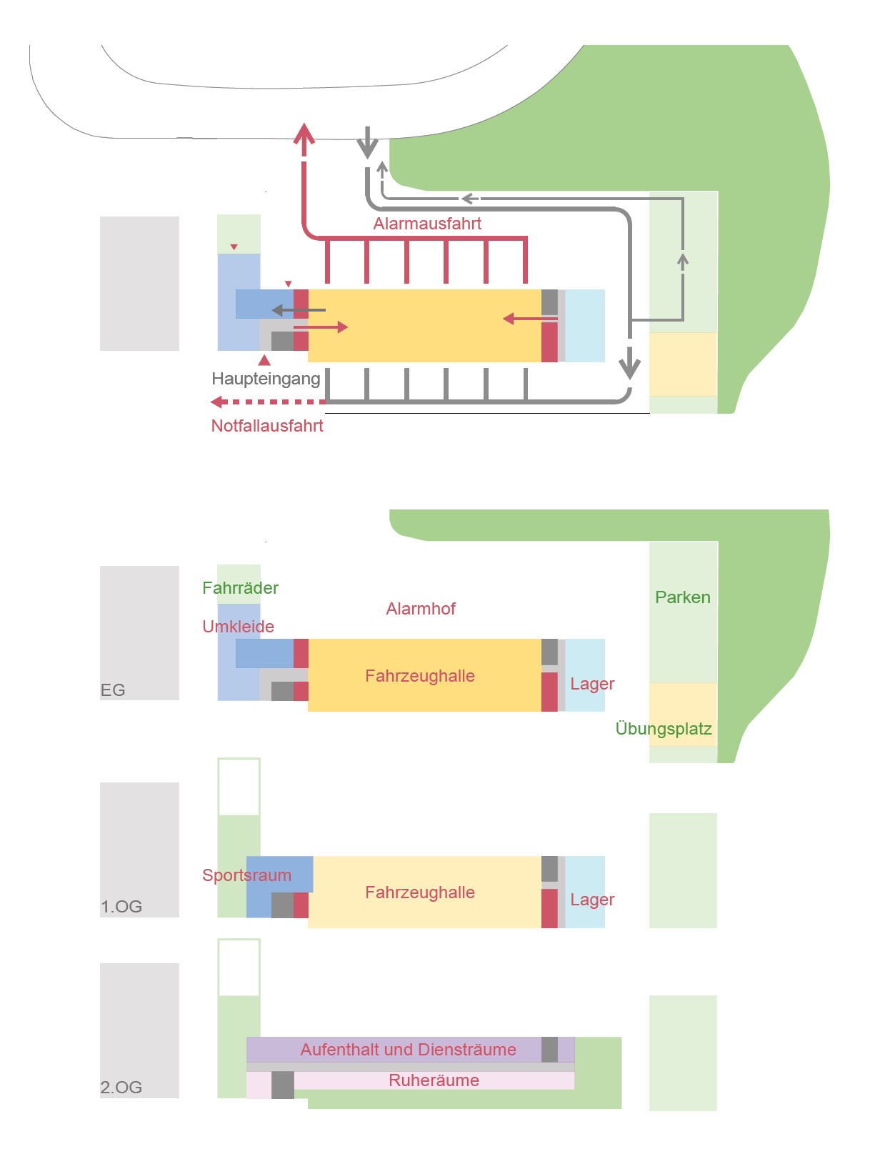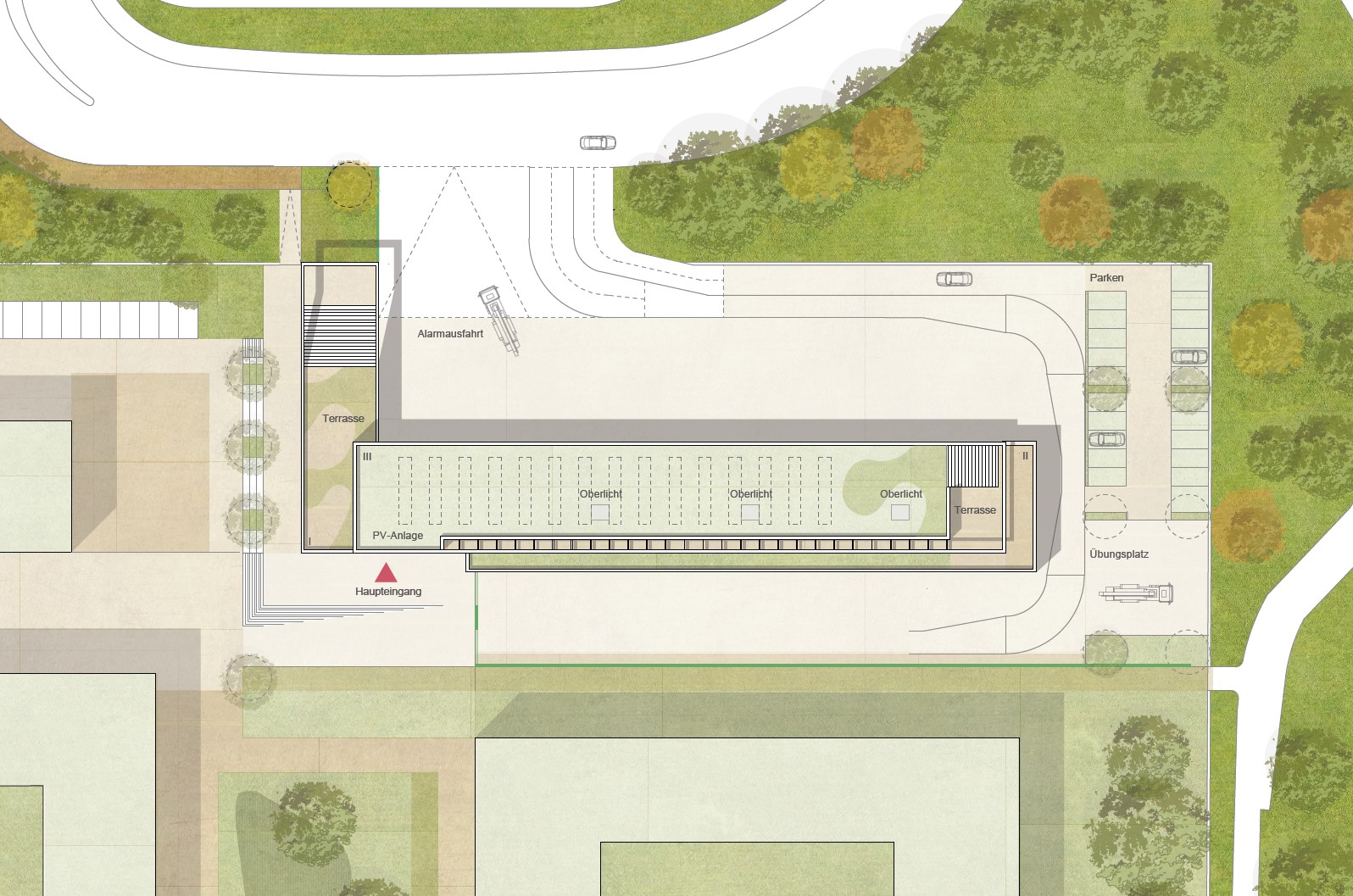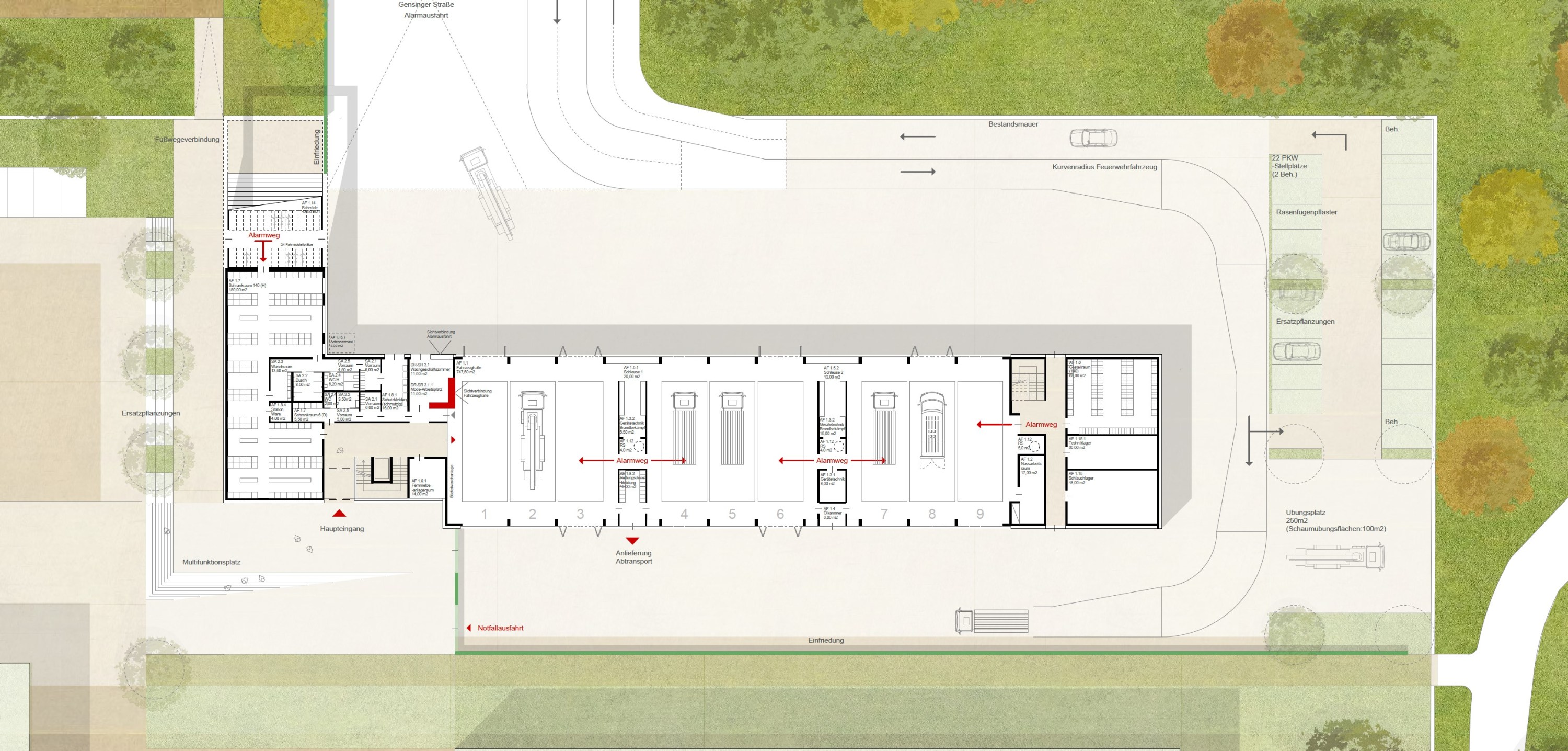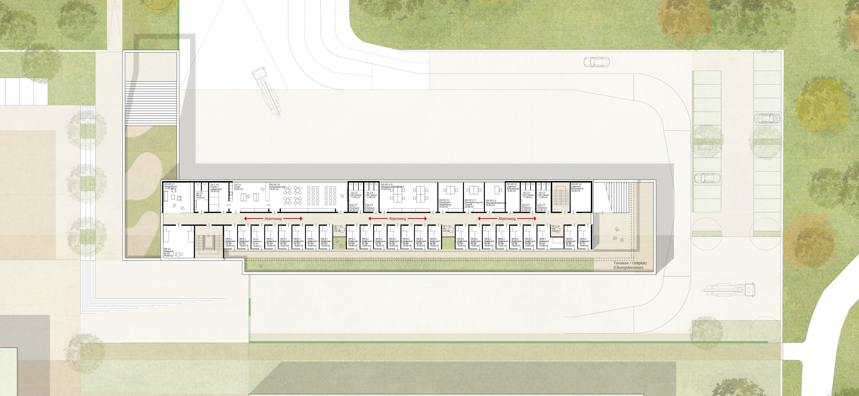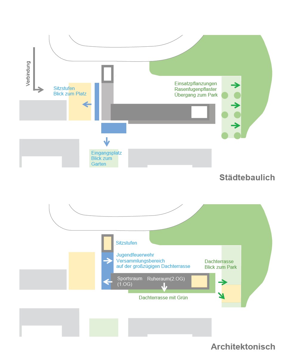 Multifunktionsgebäude hat Ähnlichkeit mit einem Dorf. Ein Hybrid, der die Potentiale aus dem Zusammenspiel verschiedener Nutzungen zu etwas Neuem entwickelt. Durch eine klare Haltung entsteht ein kraftvolles und harmonischen (Alt und Neu) Ensemble, welches auf städtebaulichen Kontext und die Topografie reagiert. Die kompakte Kubatur mit einer effizienten Erschließungs- und Flächenorganisationen, eine daraus resultierende optimierte Fassadenabwicklung und klare konstruktive Trennungen lassen einen Neubau großer Wirtschaftlichkeit. Ziel des Konzepts ist es, das große Potential des Geländes zu einem Campus weiterzuentwickeln, der für Schülerinnen, Schüler und Erwachsenen ein vielfältiges Angebot von Urbanität und Natur, Kommunikation und Rückzug bietet, das Leben und Lernen verbindet.